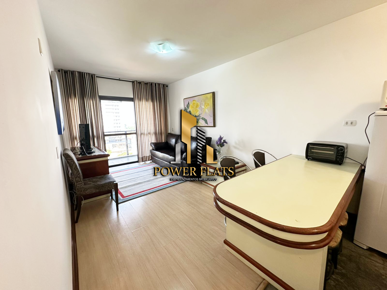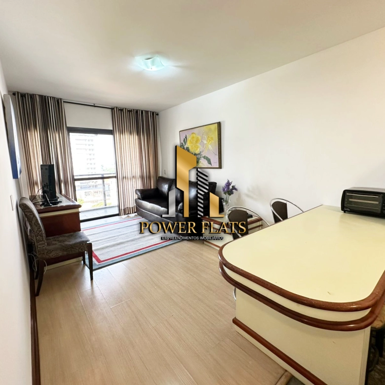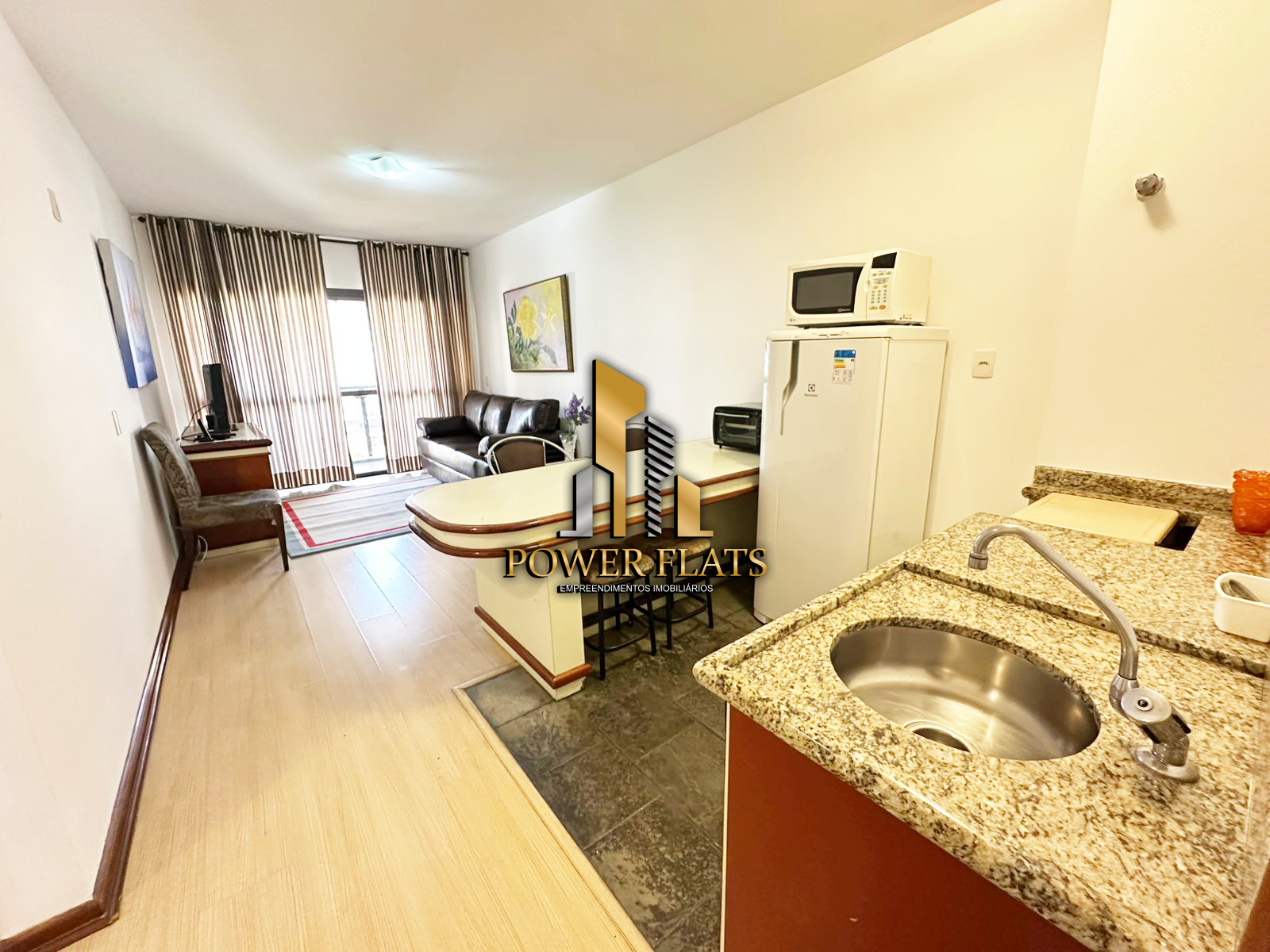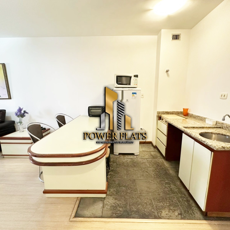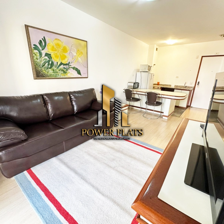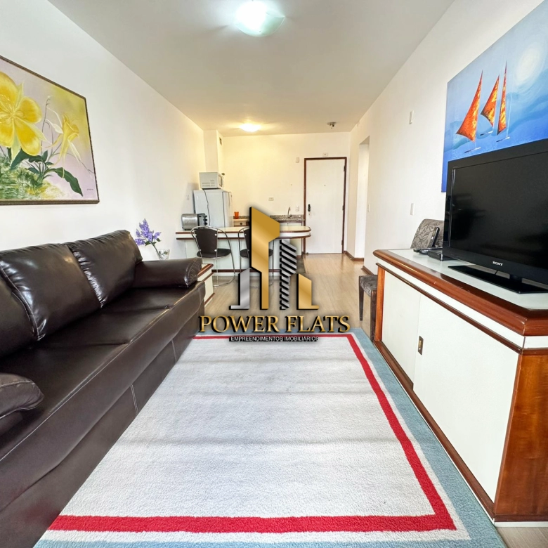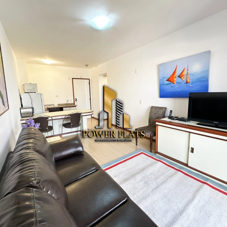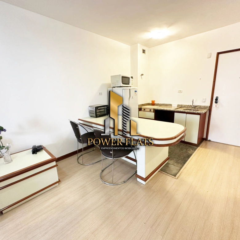 O The Plazza oferece flat mobiliado com 1 dormitório, 1 vaga de garagem, sala ampla, cozinha americana equipada e 1 banheiro, pronto para morar com conforto e praticidade.